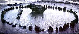 It is believed that these timber circles were used by our prehistoric ancestors in a practise known as excarnation - exposing the dead to the elements, birds and wild animals. The belief being that allowing the flesh to rot from the bone in the open air would enable the person's spirit to be liberated. The outer ring was built of split young oak trunks and were set up in the manner of a stockade, a small opening just large enough for a person to slip through was allowed by using a section of a tree which was forked, the outer ring was probabley 8 feet tall. The lay out and sheer effort involved in moving the trees to this site all point to this being an extremely important ceremonial/religous site to our Bronze Age ancestors and many archeaologists consider this the Bronze Age discovery of the decade. Latest News on Seahenge |