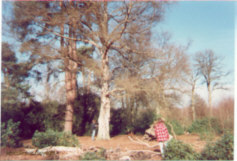 One of the biggest silver Birches(Betula pendula) in Britain, this tree had a circumference of 3.02m at breast height when we measured it in 1996. The tree was in good health and still growing. There is also a fine specimen of pine(pinus) growing beside the birch. Birch and pine trees share the same mycorhizal partners and it has been suggested that because the mycorhizal can connect to both trees at the same time it can equal out the nutrients for optimum growth periods and extend the trees protection from pathogen attack. |